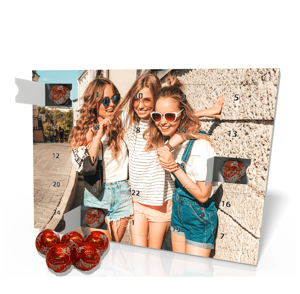 Personalisiere deinen Adventskalender im Querformat (22 x 16 x 2 cm) mit Ihren eigenen Bildern oder Motiven. Er enthält 24 kleine Genussmomente mit Lindt Lindor-Mini-Kugeln (ca. 288 Gramm). Der Kalender kommt mit einem praktischen Aufsteller. Einfach zu gestalten dank unserem benutzerfreundlichen Online-Konfigurator